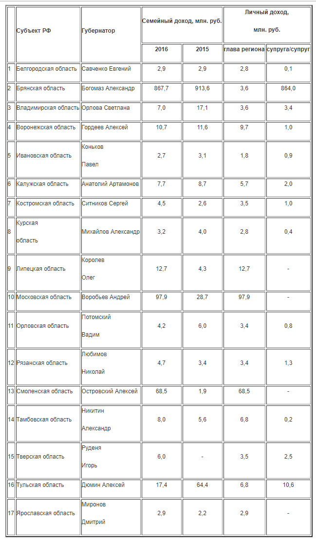 Получается,что чем круче и успешнее область тем меньше доход в семье губернатора!Вывод:надо бороться за порядочных Губернаторов и вводить их в правительство РФ.Неужто это так сложно?