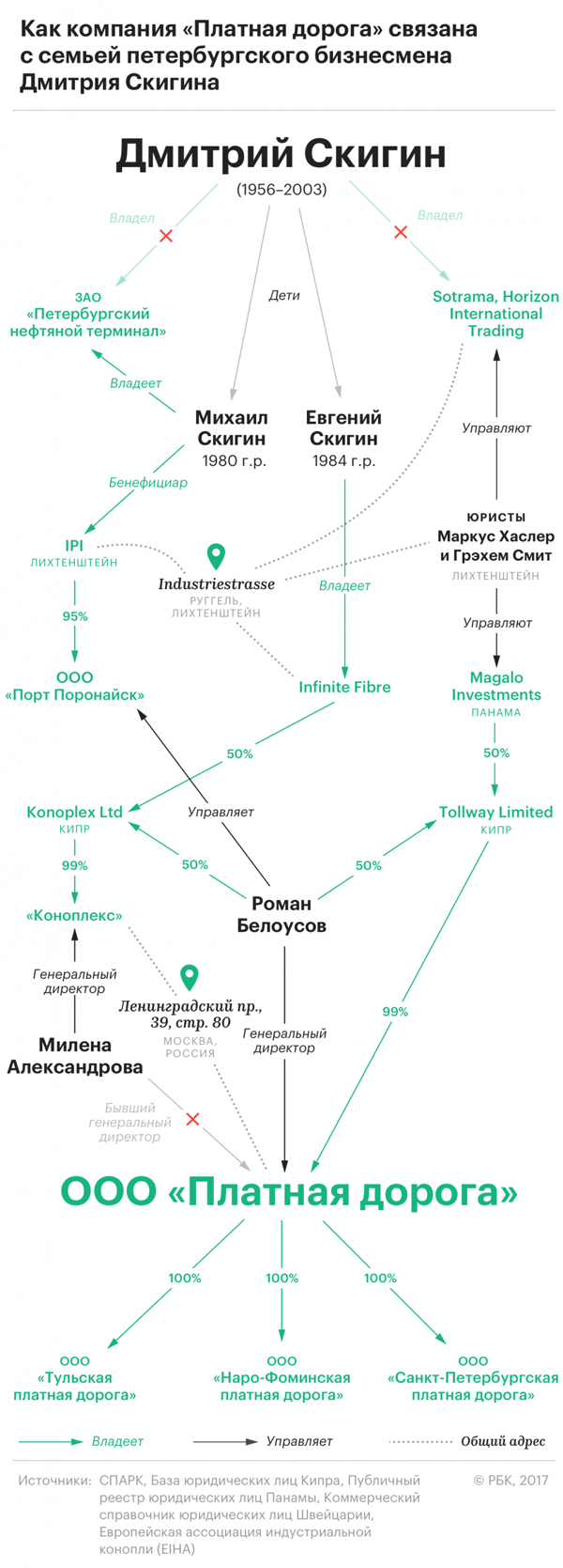 «Платную дорогу» с наследниками Дмитрия Скигина, как показало расследование РБК, связывают следующие нити. Первая связана с цепочкой офшорных фирм, которые выступают владельцами «Платной дороги», и компаний Дмитрия Скигина.