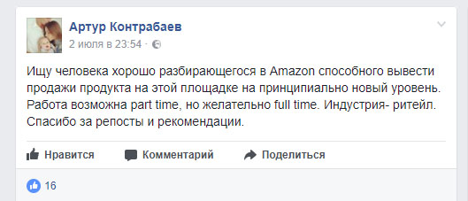 «Ищу человека хорошо разбирающегося в Amazon способного вывести продажи продукта на этой площадке на принципиально новый уровень. Работа возможна part time, но желательно full time. Индустрия- ритейл.
