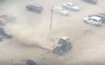 Трактор просто поднимает клубы пыли, которые тут же оседают обратно на землю и на окружающие автомобили. Неподалеку от трактора находилась женщина, которая, похоже, работает на стоянке (когда трактор закончил «работу», она удалилась в будку охраны):