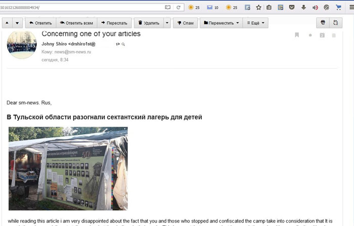 На почтовый ящик редакции ИА «SM-News» пришло письмо от читателя, представившегося жителем США. Некто Джон Широ, прочитав статью «В Тульской области разогнали сектантский лагерь для детей», испытал разочарование от того, «что вы и те, кто остановил и конфисковал лагерь, сочли, будто это ваше право и ваша привилегия рассказывать людям, во что им верить в их душах».