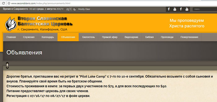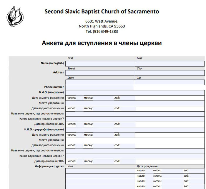 «Баптистская церковь» в Сакраменто существует. У нее есть сайт, контент – на русском языке. Для вступления в организацию предлагается заполнить анкету, ФИО указать на русском языке. Кроме того, каждый вступающий должен сообщить о дате въезда в США, предоставить информацию о родственниках (жене или муже), детях, «месте уверования», дате «водного крещения».
