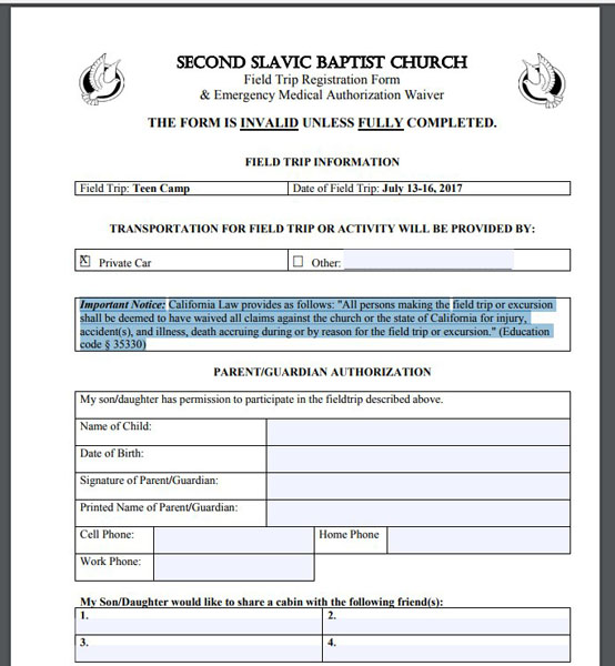 «Важное извещение: Законом Калифорнии предусматривается: «Все лица, совершающие поездку или экскурсию, считаются отказавшимися от всех претензий к церкви или штату Калифорния за травмы, несчастный случай (несчастные случаи) и болезнь, смерть, полученные во время или по причине поездки или экскурсии».