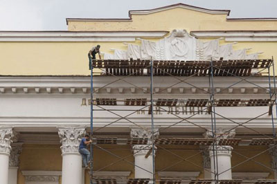 3 августа завершаются работы по восстановлению фасада бывшего ДКЖ. Элементы лепнины были демонтированы из-за аварийного состояния. Реставрационные работы завершены, зданию возвращен исторический облик.