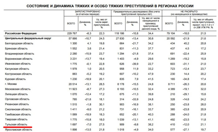В Тульской области было зарегистрировано 6160 преступлений, снижение их числа составило 8,6%. Количество тяжких и особо тяжких преступлений снизилось на 7%.