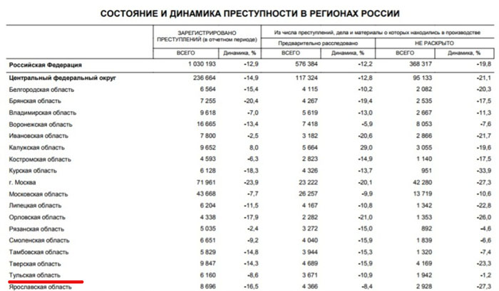 В Тульской области было зарегистрировано 6160 преступлений, снижение их числа составило 8,6%. Количество тяжких и особо тяжких преступлений снизилось на 7%.