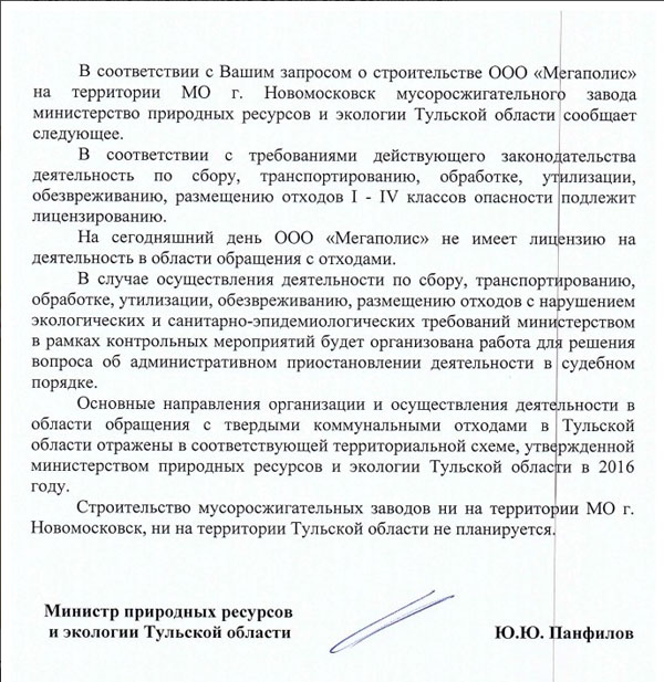 Кроме того, сообщается, что строительство мусоросжигающих заводов ни на территории МО город Новомосковск, ни на территории Тульской области не планируется.