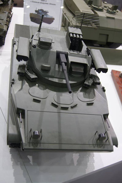 Данное изделие было продемонстрировано на моделях БМП-2 и БМП-3. Вооружение модуля представлено 57-мм автоматической пушкой низкой баллистики ЛШО-57, пусковыми установками ПТУР «Корнет» и новым перспективным управляемым ракетным комплексом «Булат» с малогабаритными ракетами для поражения огневых точек и легкобронированной и небронированной боевой техники.