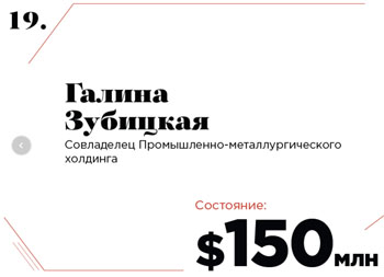 В этом году новыми участницами рейтинга Forbes Woman стали жена бывшего губернатора Тульской области Ольга Груздева, … вдова основателя Промышленно-металлургического холдинга Галина Зубицкая…