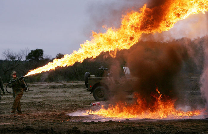 Демонстрация огнемета перед началом реконструкции сражения в Иводзиме на ранчо в Техасе