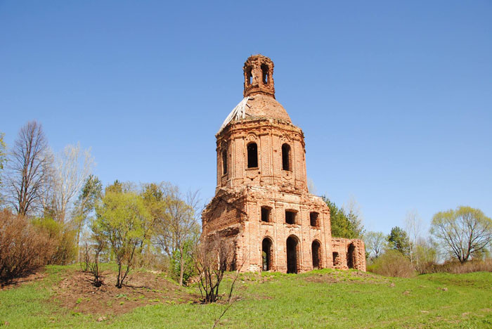 Тульская область. В северо-восточном направлении от Белёва (6 км по трассе на Суворов и 4 км в сторону) находится деревня Многополье (бывшее сельцо Карманье). Побывал там два года назад (в мае 2015). Очень интересное место. Есть церковь, вроде как в честь Иоанна ДамаскИна, построенная неким (Василием?) Павловым неизвестно когда. В инете на профильных сайтах время постройки указывается 1700-1800г.г. Совсем небольшой разрыв. И никаких конкретных источников по существованию этой церкви, только один посыл – не освящена. И место рядом с ней необычное, реальное языческое капище с украшенными деревьями и идолами из стволов деревьев. Я с их направлениями не дружен, суета и текучка дел взяли своё, забылось. Тут решил систематизировать приходы Тульской губернии, а церкви Дамаскина в Многополье-Карманье нигде нет. Стал искать причину забвения, узнал одну легенду. В уже построенной церкви, когда шла подготовка к освящению, в алтаре ощенилась с…обака. Видно, не потерпели сего деяния перспективные прихожане. Так в близлежащую Жабынь и ходили на службу, здание церковью не стало.