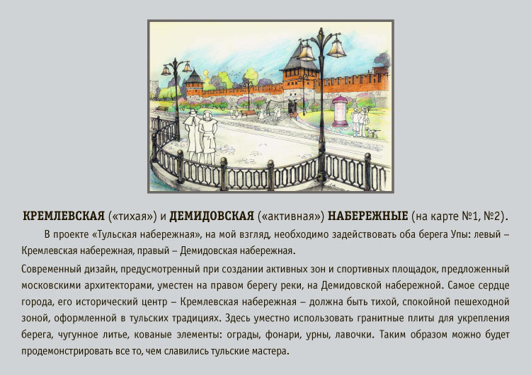 Предлагаю на ваш суд свою концепцию проекта «Тульская набережная». Будучи коренным туляком, я считаю, что часть набережной, которая примыкает к кремлю, должная быть выдержана в классическом стиле. Именно это стиль был присущ городской архитектуре XIX века в целом, и центру Тулы – в частности. Применив к новой набережной классический дизайн, мы отдадим дань уважения историческим традициям любимого города.