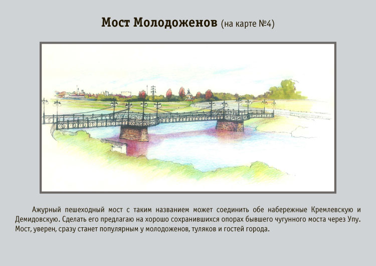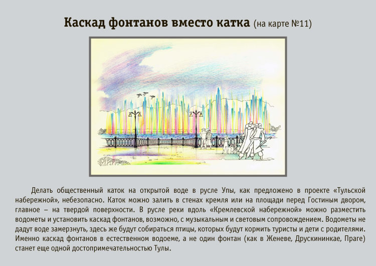 Еще мне понравилась идея сделать светомузыкальные фонтаны на Упе , это единственная фишка, которая действительно по вечерам привлекало бы на набережную много людей. Но вряд ли это осуществимо, как и всего проекта ее реконструкции.