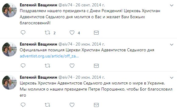 «Церковь Христиан Адвентистов Седьмого дня молится о мире в Украине. Мы молимся о нашем президенте Петре Порошенко, чтобы Бог благословил его», — написал Ващинин в твиттере 20 июня 2014 года.