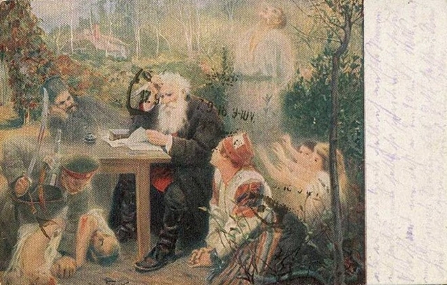 Открытка с репродукцией картины Яна Стыки «Толстой за работой в саду, окруженный призраками тех бедствий, которые терзают его родину». 1909