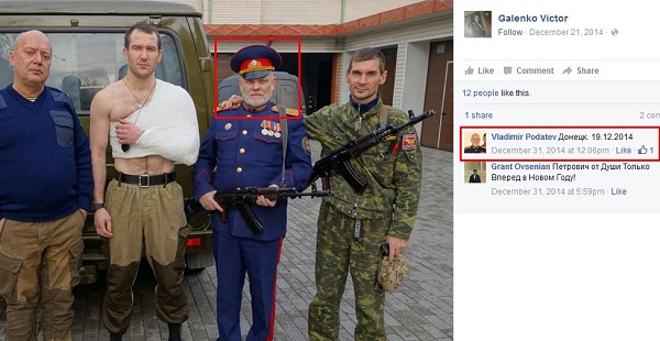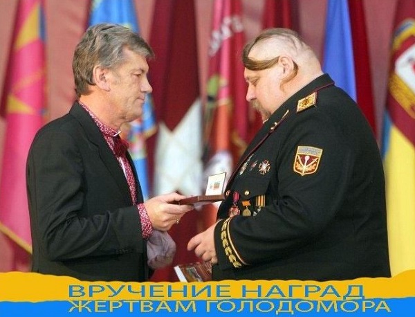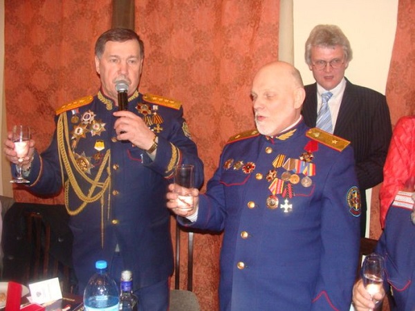 Самопальная генеральская форма, куча каких-то «левых» значков и медалек (прям как в смешном стихе г-на Каганова), лампасы, листики дубовые, вся клоунская униформа налицо, полный комплект. Наверное, перед нами какой-то очередной «психоделический фрик», гы-гы-гы, кавалер ордена «С днём рождения», гы-гы-гы, «удалой казак Степан узнаёт, что он е***н», гы-гы-гы! Это, между прочим, не хрен собачий, а Верховный атаман Международного объединения «Союз Казаков России и Зарубежья» Владимир Податев, также известный в определённых кругах под прозвищем «Пудель». Ещё более ржачно, да? Теперь смотрим вот эту фотку.
