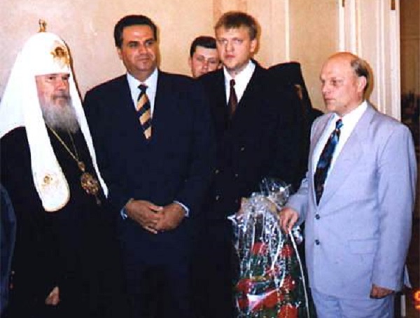 Наш «забавный» герой — сидит, а за его спиной расположилась, монаскыть, «элита» дальневосточного криминального мира. Кому интересно, погуглите «Вор в Законе Джем», например. А мы смотрим фотки далее. Вот будущий «Верховный атаман Вселенной» — зависает в каком-то кабаке с патриархом Кириллом.