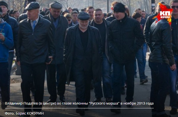 Может быть, наш Главказак только в прежние времена был влиятельным и уважаемым человеком? Он жеж на фотках не в идиотской «казачьей форме» предстаёт, а во вполне себе респектабельных пинжаках. Может, сегодня от г-на Податева, одетого в несуразный мундир, серьёзные люди шарахаются? Ой, нет! Сегодня-то пан Пудель тоже не круглый год в медальках и лампасах зажигает! Вот, к примеру, наш атаман принимает участие в «Русском марше», действие происходит уже не в лихие 90-е, а вовсе даже в благополучном и стабильном 2013-м.