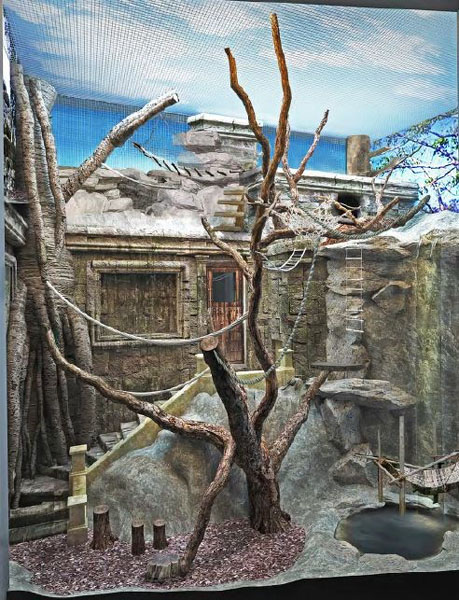 Дизайн вольеров будет выполнен из полимербетона и оснащен натуральными деревьями, канатами, веревочными лестницами и гамаками.