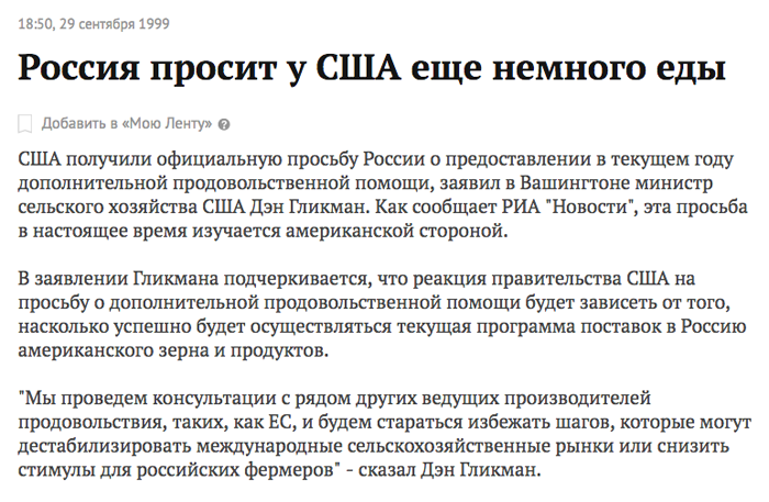 Скриншот статьи «Россия просит у США еще немного еды», опубликованной на сайте Lenta.ru в 1999 году