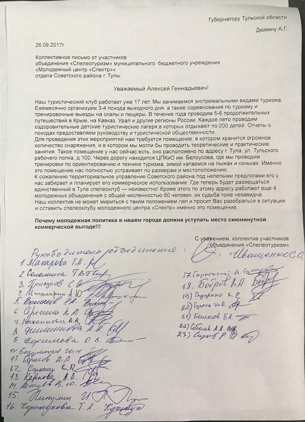Тульские любители туризма просят защиты у Алексея Дюмина