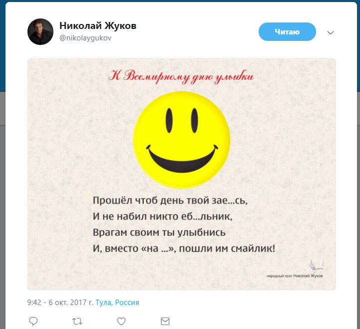 Чё за хрень вообще получается!? Уважаемые блогеры в комментариях кроют матом всех по чем зря. А Жуков в ироничной форме поздравил всех с Днем Улыбки и стал сразу матершинником ?! загляните к нему на страничку, классные стихи, особенно поздравление В.В. Путина с днем рождения, очень здорово.