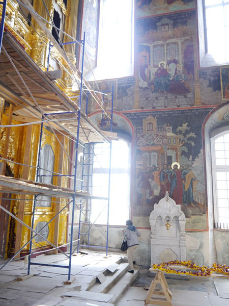 Все эти дорогостоящие работы, в том числе по реставрации в верхней части алтарной зоны были выполнены без приведения самого храма в нормальное состояние. Там не налажен климат, не сменена столярка, огромные щели в окнах, в то же время зачем-то переложен пол. Живопись предварительно не полностью раскрыта и не укреплена.