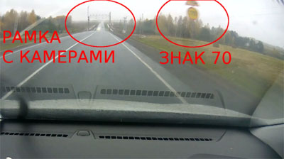 Итак, дорогие друзья автомобилисты, уже 20-го октября ГИБДД начнет устанавливать камеры фиксации нарушений за временными желтыми дорожными знаками. А сейчас я вам покажу, к чему это приведет. Вот на видео классический пример штрафа из воздуха. Обратите внимание — автомобиль едет по абсолютно ровной дороге, никаких признаков ремонтных работ нет. И тут, прямо перед рамкой, на которой висят камеры контроля скорости установлен желтый знак «70»! Никаких работ нет, а знак есть!