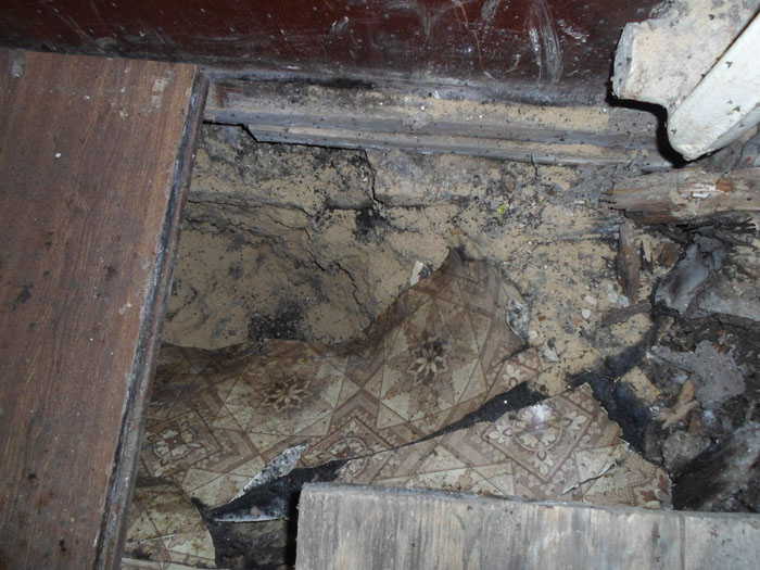 — Кое-как отремонтированная канализационная труба не выдержала долгой эксплуатации, и снова прорвалась. Нечистоты заполнили пространство между полом и грунтом (подвала под домом нет) и сами стали служить заглушкой. Так как жильцы ни разу не жаловались, работники ЖЭУ даже проверять не приходили. Но теперь из-за мух и усиливающегося неприятного запаха работников ЖЭУ все же вызвали. После долгих препирательств – кто (бабушка, или работники ЖЭУ) должен очистить хотя бы доступ к прорвавшейся трубе, приехали слесари из ЖЭУ. Подход к трубе почистили, трубу отремонтировали. Но доски и плиты работники ЖЭУ положили прежние – прогнившие. Сказали, что временно. Плотник сказал, что позже придет с новыми досками и сделает все, как положено. Несколько дней мы ждали плотника. Но он так и не пришел. Позвонили в ЖЭУ. Там ответили, что полы в квартире являются собственностью жильцов и менять их должны жильцы. Так что никакой плотник с новыми досками не придет. Вот как теперь выглядит, ставший опасным для бабушкиной жизни, участок ее кухни. Больше в кухню мы ее не пускаем. Чтобы костыль не провалился в большую щель между плитами, или она вдруг не наступила бы по забывчивости на одну из прогнивших плит.