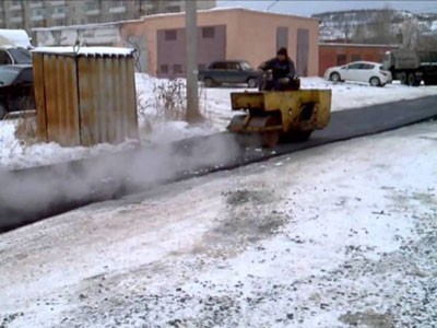 Да чё тут делать!? Сначала проезжает машина, которая сметает снег, за ней дорога посыпается слоем песка, укатывается, потом кладется асфальт — та марка, которая с +5 до -20. Вот и всё. Снег, при наличии техники — вообще не проблема. А тот, что падает, для раскаленного асфальта — ничто.