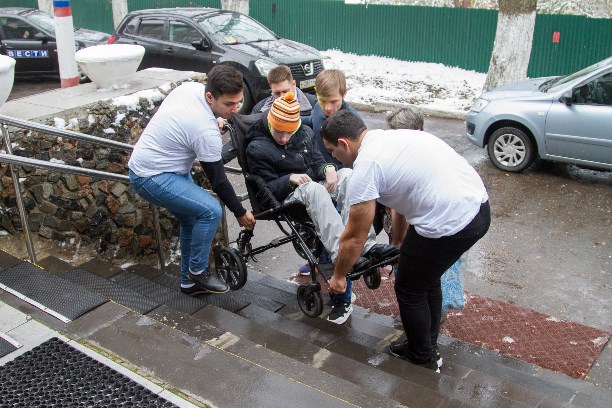 На форуме работали волонтеры. Но даже им, здоровым молодым людям, было тяжеловато втащить коляску с подростком в библиотеку.