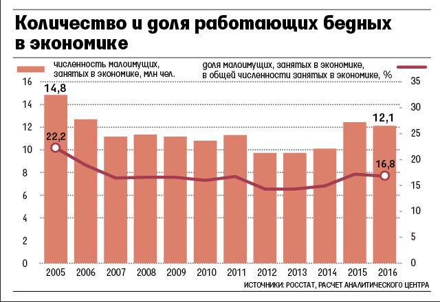 По данным Росстата, зарплату ниже прожиточного минимума получает около 2 млн россиян (7,3% работающих на апрель 2017 г.). Если же учесть не только зарплату, но и остальные доходы, а также то, что эти доходы тратятся и на членов семьи, количество работающих бедных возрастает в разы – около 12,1 млн человек в 2016 г., или 16,8% трудоспособного населения, рассказывает эксперт управления социальной политики аналитического центра Владимир Трубин.