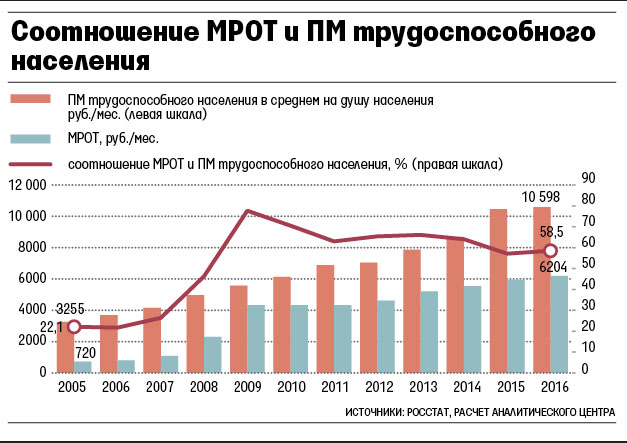 В России нет такой квалификации, которая «достойна» минимальной российской зарплаты – 7800 руб., указывала весной социальный вице-премьер Ольга Голодец и предлагала «предметно говорить» с компаниями, которые так мало платят своим работникам. Минимальная зарплата не должна быть ниже прожиточного минимума трудоспособного населения – это требование Трудового кодекса, которое годами не выполняется, отмечается в бюллетене. Требование не нарушается – его выполнение отложено до принятия необходимого закона, возражает представитель Минтруда. В сентябре приравнять МРОТ к прожиточному минимуму поручил президент Владимир Путин, спустя всего неделю правительство одобрило соответствующий законопроект: с 1 января 2018 г. МРОТ повысится примерно до 85% прожиточного минимума, с 1 января 2019 г. – до 100%. Это позволит снизить бедность и неравенство, утверждает представитель Минтруда. Но проблему бедности не решит, уверен Трубин: минимальная зарплата рассчитывается исходя из стоимости потребительской корзины, состав которой не соответствует рациональным нормам потребления здорового человека. Государство сначала экономит на зарплатах, а затем теряет на медицинском обслуживании людей с заболеваниями и дефицитом веса, сетует он. Такая экономия замедляет экономический рост, продолжает Трубин: у бедных людей нет мотивации повышать производительность труда, многие уходят в теневую занятость, а предприятия при наличии дешевой рабочей силы не заинтересованы внедрять новую технику, совершенствовать технологию производства. Кроме того, такие люди требуют социальной поддержки: в прошлом году регулярные и единовременные денежные выплаты из региональных бюджетов получили 3,7 млн человек – около 29 млрд руб.