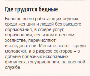 То, что более 10 млн работающих россиян не могут обеспечить достойную жизнь себе и своей семье, нельзя считать нормальной ситуацией, сказано в бюллетене. Даже если на работу выходит больше членов семьи, из бедности она, как правило, не выбирается, говорит Трубин: чтобы существенно увеличить доход, нужно приобрести новую профессию, повысить уровень образования либо переехать, а рынок труда не обеспечивает достаточно вакансий с более высокой зарплатой и сохранением профессионального статуса. То есть бедность стимулирует занятость, которая не приводит к росту доходов. Бедных семей из 2–3 человек, из которых двое работают, крайне мало, спорит Капелюшников, в основном это семьи со множеством иждивенцев – детей, безработных, пенсионеров.