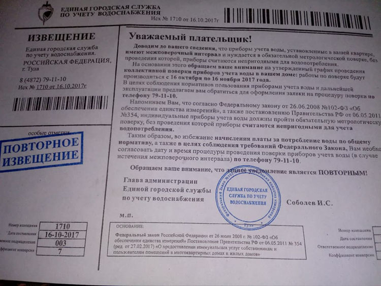 Очевидно, правоохранительные и надзорные органы, не говоря про управляющие компании, просто не имеют доступа к открытым источникам в сети Интернет. В противном случае столь масштабная деятельность проходимцев была бы просто невозможной. Ведь, внимание, фирмы (вообще юрлица) «Единая городская служба по учёту водоснабжения» не существует. Ни в Туле, ни где бы то ни было в Российской Федерации. Нет её, и всё.