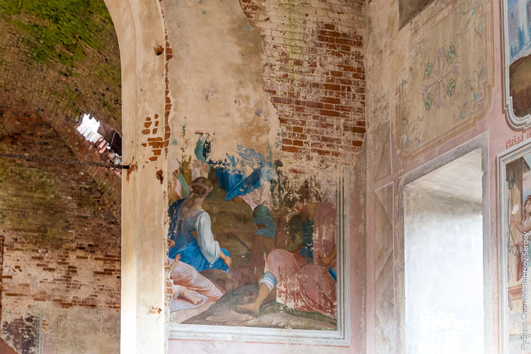 Зато самое интересное нас ожидает внутри, это один из немногих заброшенных храмов в Тульской области, в которых росписи сохранились в таком отличном состоянии: