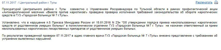 8 ноября прокуратура Тульской области сообщила о нарушениях, обнаруженных в ходе проверки в городской больнице №7. Сотрудники прокуратуры выяснили, что в медицинском учреждении нарушают приказ, связанный с приемом наркотических препаратов от родственников умерших больных.