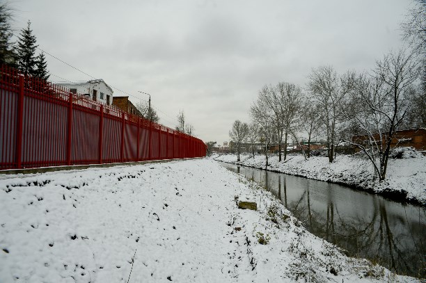 Ограду ставят на берегу, противоположном тому, где стоит Кремль, а не возле него. Ограждают корпуса завода, а не территорию. где планируют сделать детские и спортивные площадки, сиреневый сад и велодорожку.