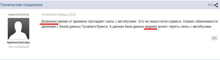 Мы же не верим, что авторы данного текста могли лукавить? Тогда придётся заметить: во всём министерстве господина Ракова, а, может быть, и во всем правительства господина Андрианова, не нашлось ни одного чиновника или иного должностного лица, которое сподобилось бы дойти, или просто позвонить в «ТулаАвтоТранс». С тем, чтобы сказать примерно следующее: «Ребята, мы вам тут, в «белом доме», всякие лицензии выдаём, разрешения, согласования. Не могли бы вы в качестве ответного жеста пояснить, исправно ли работает ваша база данных, которая завязана на «Транспорт 71″, и насколько качественно проходит передача данных?». Нет таких смелых в правительстве Тульской области. Да и зачем вообще напрягаться. Никто ведь не увидит и не оценит.
