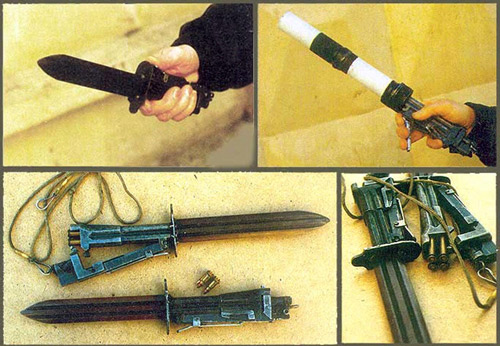 В последнее десятилетие существования СССР отечественные конструкторы решили значительно повысить защищенность наших разведчиков, изготовив для них не имеющий аналогов в мире стреляющий нож НРС-2 «Взмах». Кроме крепкого стального клинка, в рукоятку обычного с виду штык-ножа был вмонтирован специальный однозарядный механизм, позволяющий производить стрельбу мало шумными патронами СП-4 калибра 7,62 мм.