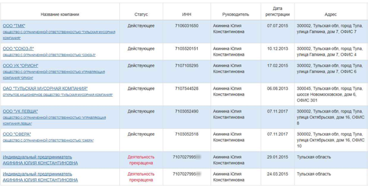 К слову, у «Тульской мусорной компании» общий директор с «Орионом» — Юлия Константиновна Акинина (ИНН 7107027995**). Она не только успешная бизнес-леди, но и аффилирована Соловову и Гусеву, а полный список предприятий, где ей доверено руководство, выглядит как-то так:
