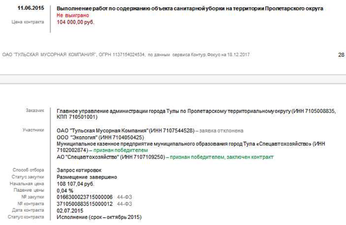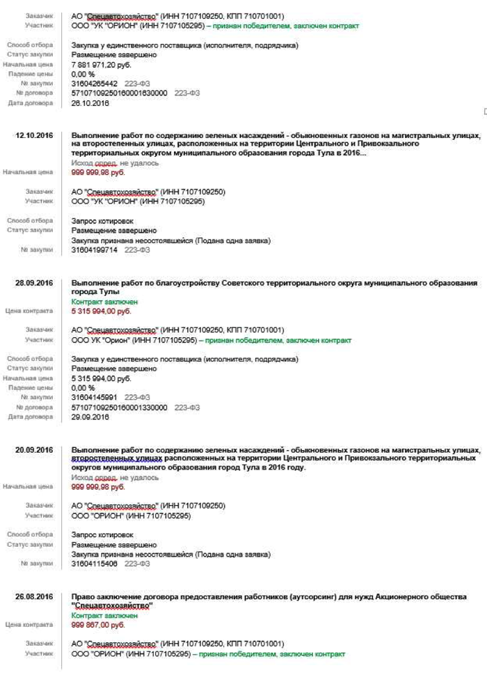 Здесь не получится приложить такую же слепленную разово подборку закупок, так как они периодически перебиваются заказами самой «Тульской мусорной компании», но заметим, что из десятков госзаказов АО «САХ» не получило контракт лишь однажды.