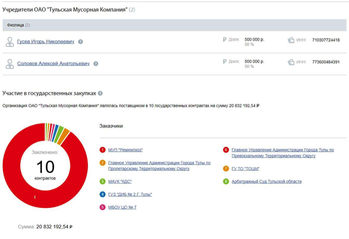 Как можно видеть на кадре выше, в равных долях бизнесмены владеют ОАО «Тульская мусороперерабатывающая компания». И ладно Гусев, он много в каких тульских компаниях замечен, ведёт дела, и вряд ли кто-то обратил на него пристальное внимание, если бы не это соседство с Солововым.
