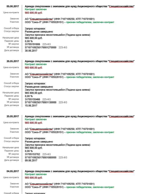 На скриншотах может быть не очень хорошо видно, но в документах указаны контракты, которые предприятие заключает с ООО «Союз Л». Прописано, что в контракт входит «аренда спецтехники с экипажем для нужд АО «Спецавтохозяйство». Всегда одна заявка, всегда закупка признаётся несостоявшейся, и почему-то всегда деньги, 985 600 рублей (ни больше, ни меньше), всё же уходит компании «Союз Л». Такая вот тульская магия ЖКХ.