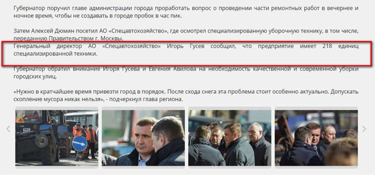 Игорь Гусев в интервью кичится успехами вверенной ему структуры, и даже зачем-то хвастает в интервью, что его «Спецавтохозяйство» в своём распоряжении имеет целых 218 единиц спецтехники. Что примечательно, хвастается буквально в лицо губернатору Алексею Дюмину, который, по понятным причинам, решил провести ревизию на предприятии.