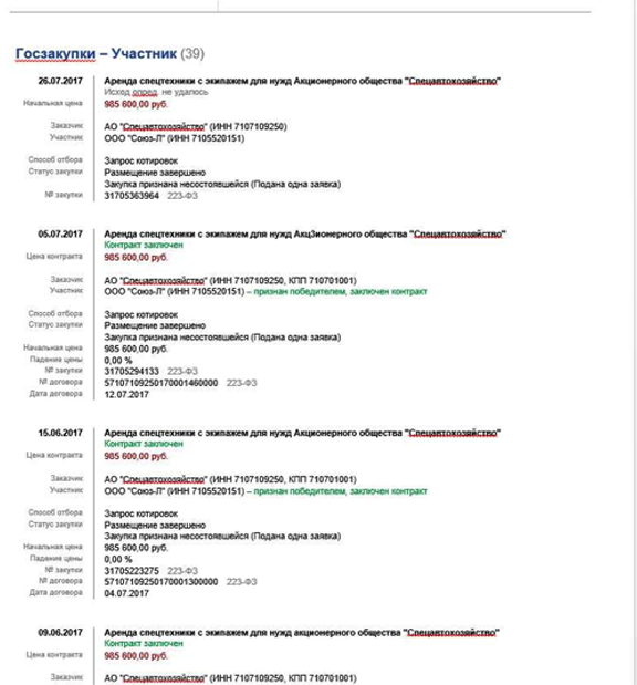 На скриншотах может быть не очень хорошо видно, но в документах указаны контракты, которые предприятие заключает с ООО «Союз Л». Прописано, что в контракт входит «аренда спецтехники с экипажем для нужд АО «Спецавтохозяйство». Всегда одна заявка, всегда закупка признаётся несостоявшейся, и почему-то всегда деньги, 985 600 рублей (ни больше, ни меньше), всё же уходит компании «Союз Л». Такая вот тульская магия ЖКХ.