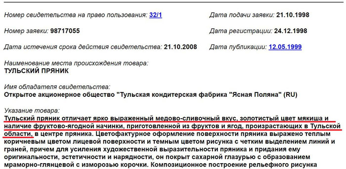 Но ведь Свидетельство на право использования наименования места происхождения товара № 0032/1 «Тульский пряник» действительно выдано «Ясной Поляне». Посмотрим внимательнее, что же написано в Свидетельстве про настоящий тульский пряник: