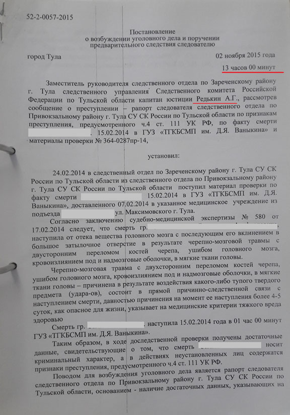 Вот доказательства: в период этой проверки один и тот же следователь в течение 30 минут возбуждает три уголовных дела в одном и тот же районе Тульской области по ранее вынесенным отказным материалам. Статьи — по убийству и насилию над детьми. И, что примечательно, ревизоры тут как бы и ни при чем, ведь они сами права не имеют возбуждать или прекращать уголовные дела, потому как следователями никто из них не является. Все проверяющие из УСБ СК РФ — инспекторы. А приказывают сыщикам как Бастрыкин.