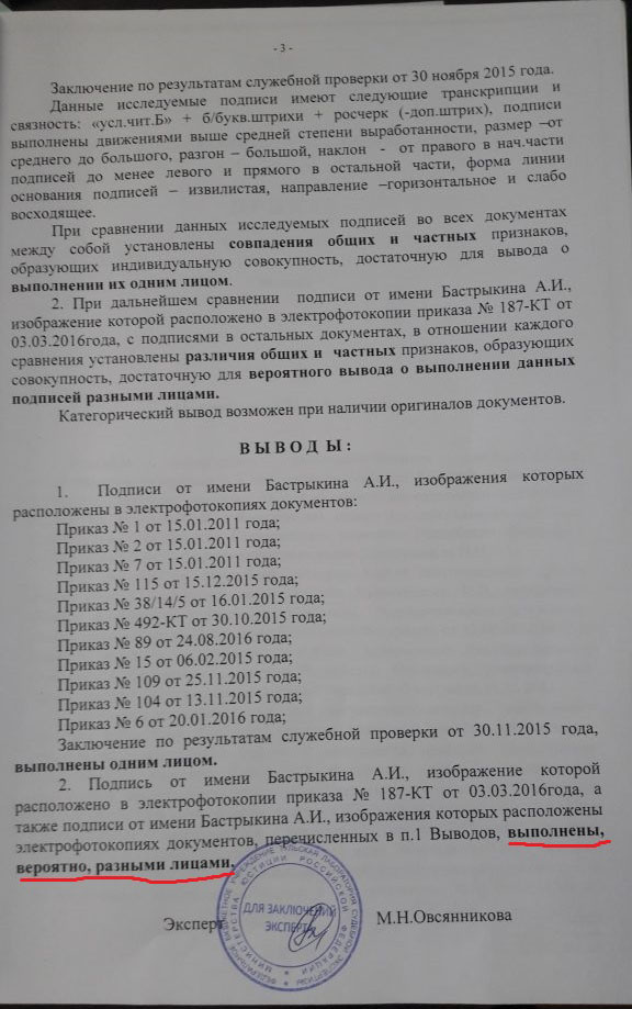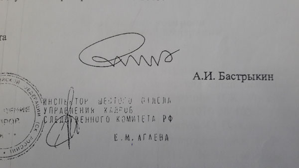 Но и это еще не все: ряд сотрудников тульского управления СКР были уволены совершенно невероятным способом. Например, руководитель отдела процессуального контроля СК РФ по Тульской области Павел Коршунов, по документам, освобожден от должности приказом Александра Бастрыкина, но экспертиза в рамках гражданского иска к СК показала: подпись Александра Бастрыкина на приказе — [возможно] поддельная.