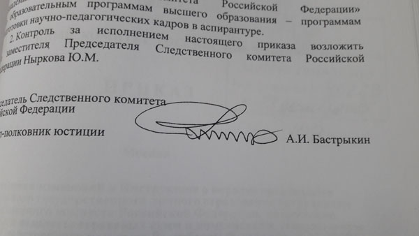 Но и это еще не все: ряд сотрудников тульского управления СКР были уволены совершенно невероятным способом. Например, руководитель отдела процессуального контроля СК РФ по Тульской области Павел Коршунов, по документам, освобожден от должности приказом Александра Бастрыкина, но экспертиза в рамках гражданского иска к СК показала: подпись Александра Бастрыкина на приказе — [возможно] поддельная.
